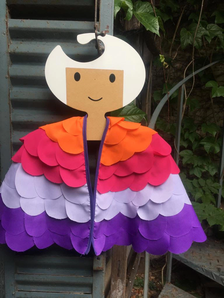 Tienen mas de 120 plumas cosidas a un respaldo de lienzo con terminacion de suaves elasticos para que los chicos puedan levantar sus alas y volar. Con el tiempo y el uso las alas pueden deshilacharse por no estar terminadas con overlock. Esto les dara un acabado unico con efecto "emplumado".
