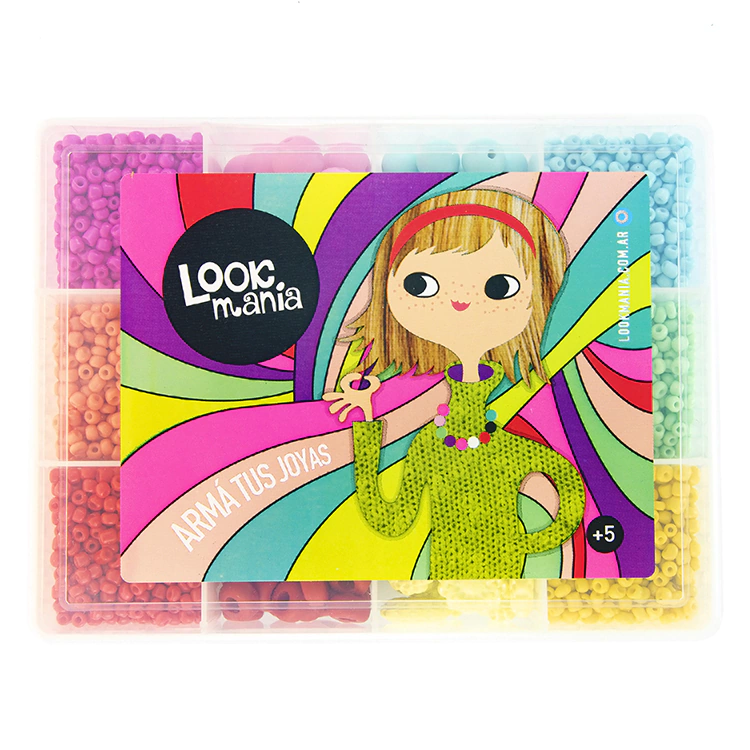 Medida: 17x13x4.5 cm. Viene con mostacillas de vidrio, plástico, formitas de colores y tanza para armar tus propias joyas!