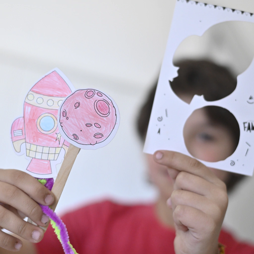 Se colorea el cohete y la luna, se enganchan los limpiapipas rodeando el palito, se pegan las formas y a viajar y jugar por el espacio.